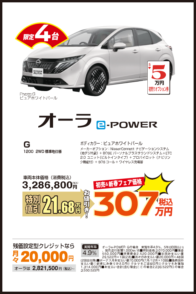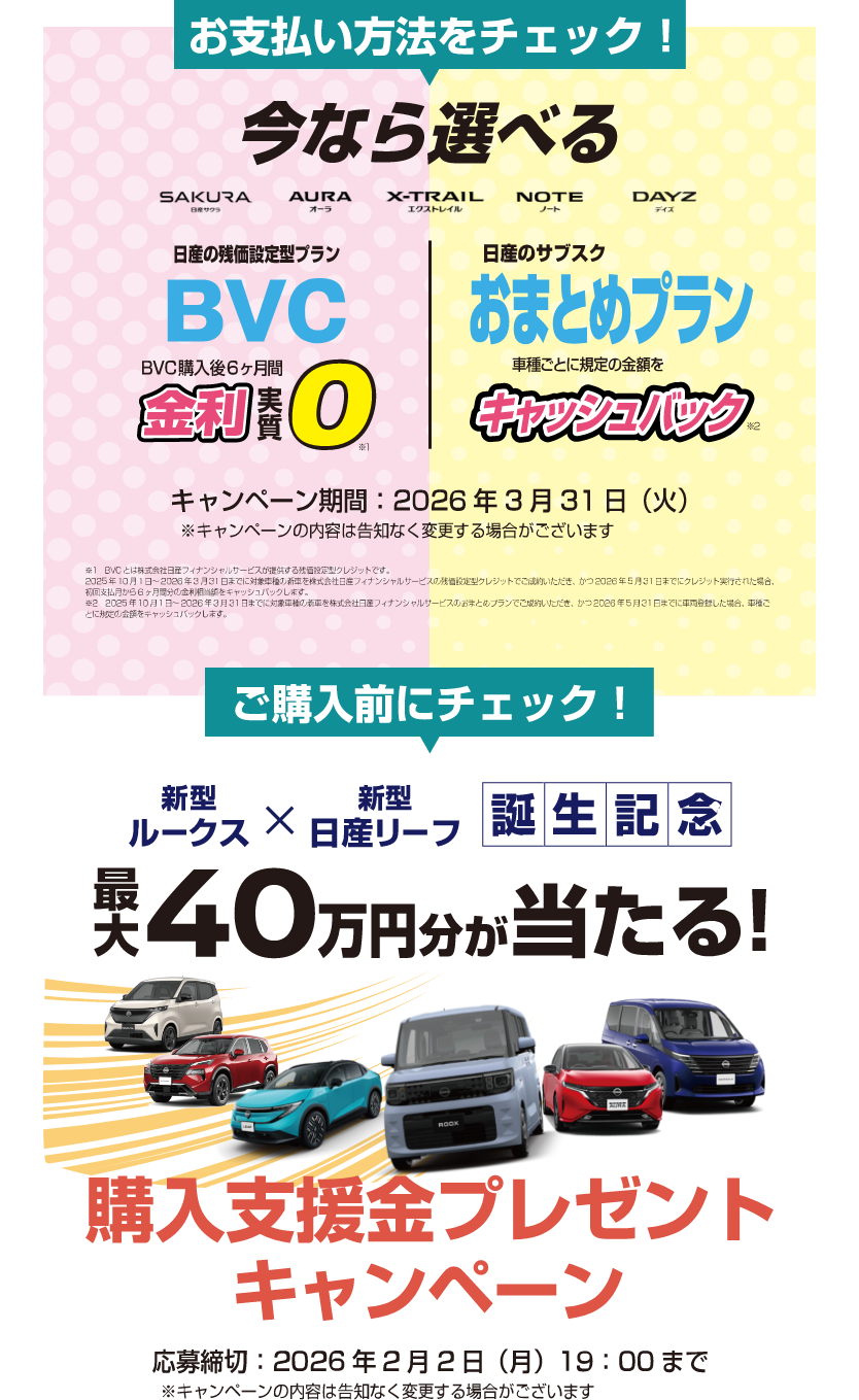 新車ご成約でオプション券プレゼント アリア、リーフ、セレナ、エクストレイル7万円 ノート、オーラ、キックス5万円 軽自動車3万円 ※フロアカーペット・ナンバープレートリム・プラスチックバイザーはご利用対象外です ※法人名義のご契約は対象外となります。詳しくはカーライフアドバイザーまでお問い合わせください。 新車購入時にお使いいただけます(商用車は除きます)
