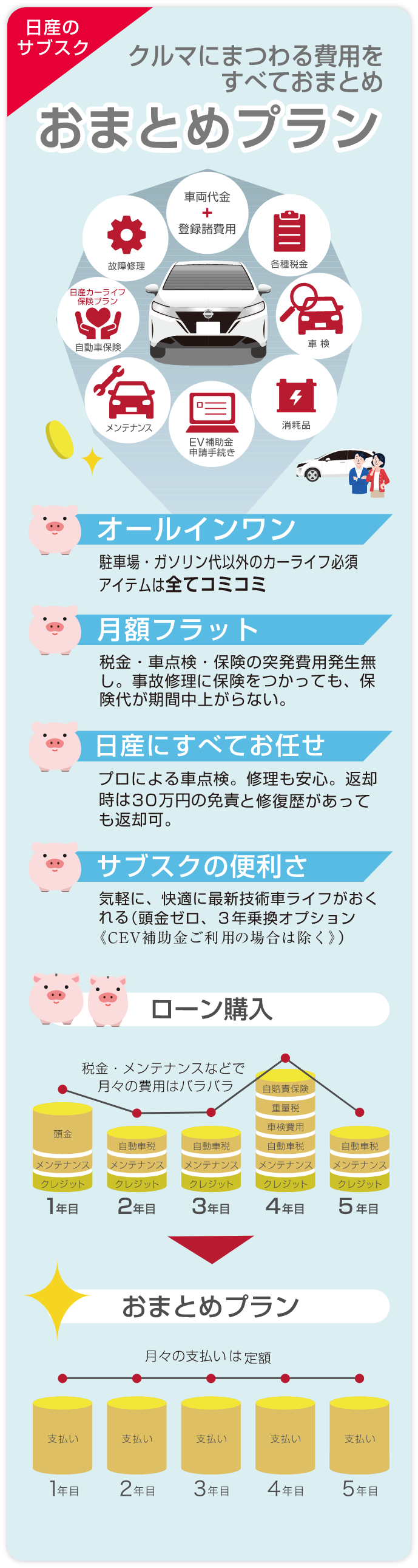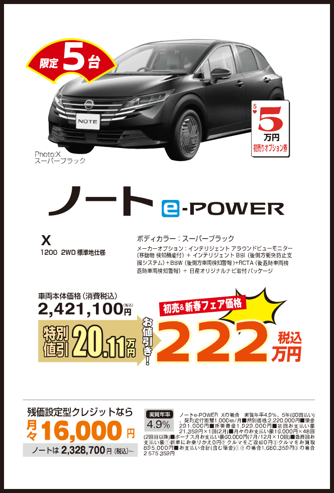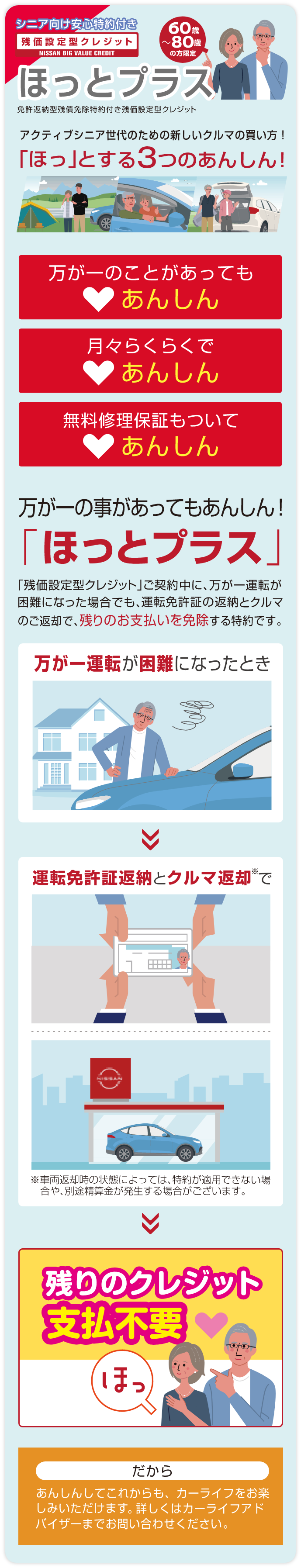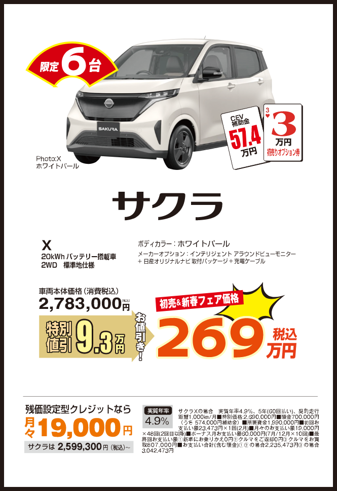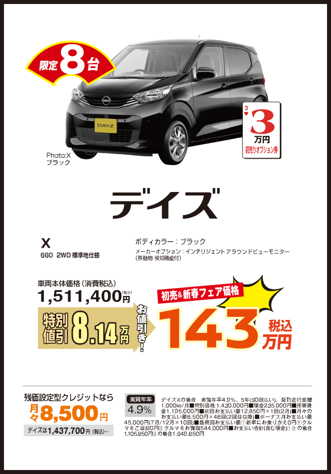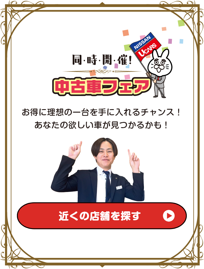 新車ご成約でオプション券プレゼント アリア、リーフ、セレナ、エクストレイル7万円 ノート、オーラ、キックス5万円 軽自動車3万円 ※フロアカーペット・ナンバープレートリム・プラスチックバイザーはご利用対象外です ※法人名義のご契約は対象外となります。詳しくはカーライフアドバイザーまでお問い合わせください。 新車購入時にお使いいただけます(商用車は除きます)